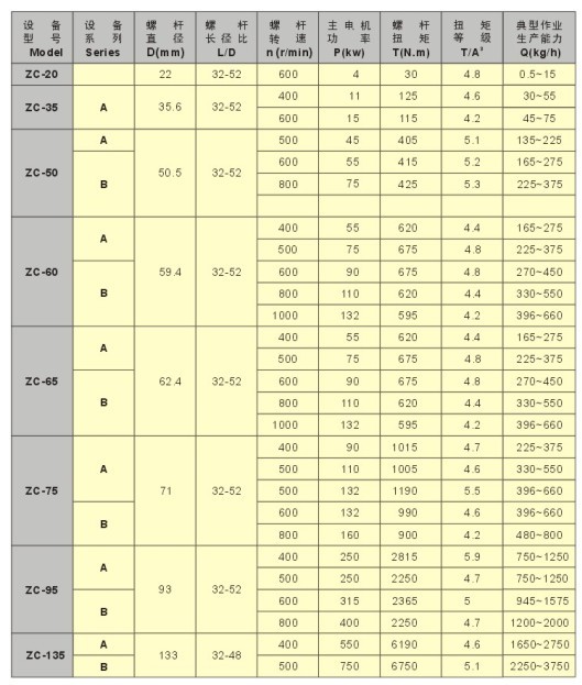 ZC-A、B系列雙螺桿機型參數(shù)表