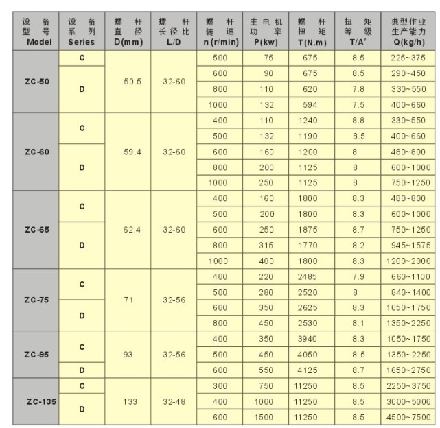 ZC-C、D系列雙螺桿擠出機組主要技術參數(shù)