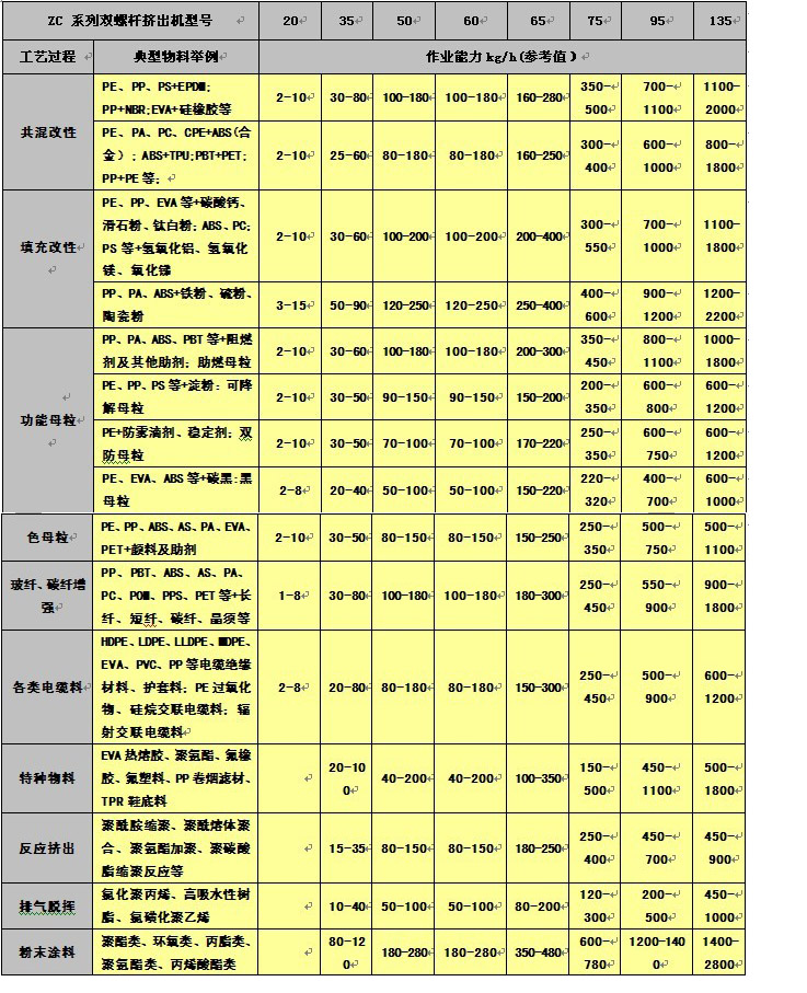 ZC系列同向平行雙螺桿擠出機典型物料作業(yè)能力一覽表(參考值)